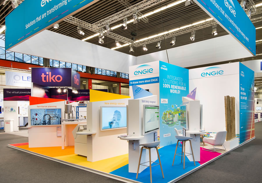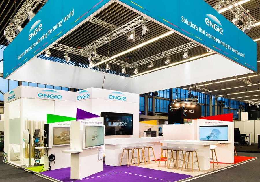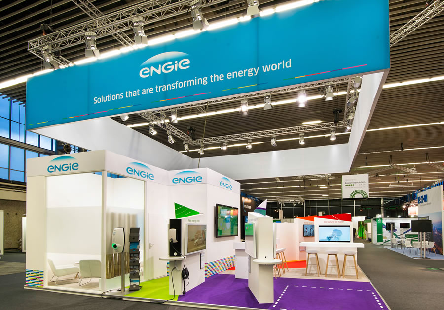 Rechtstreeks in contact met de marketingafdeling van het hoofdkantoor van Engie in Parijs is deze stand ontworpen en gerealiseerd. De verschillende gekleurde vlakken op de beursvloer stonden voor de verschillende afdelingen waarbinnen Engie zorgdraagt voor oplossingen in de energie branche. Door de opvallende kleuren viel de stand in positieve zin enorm op.